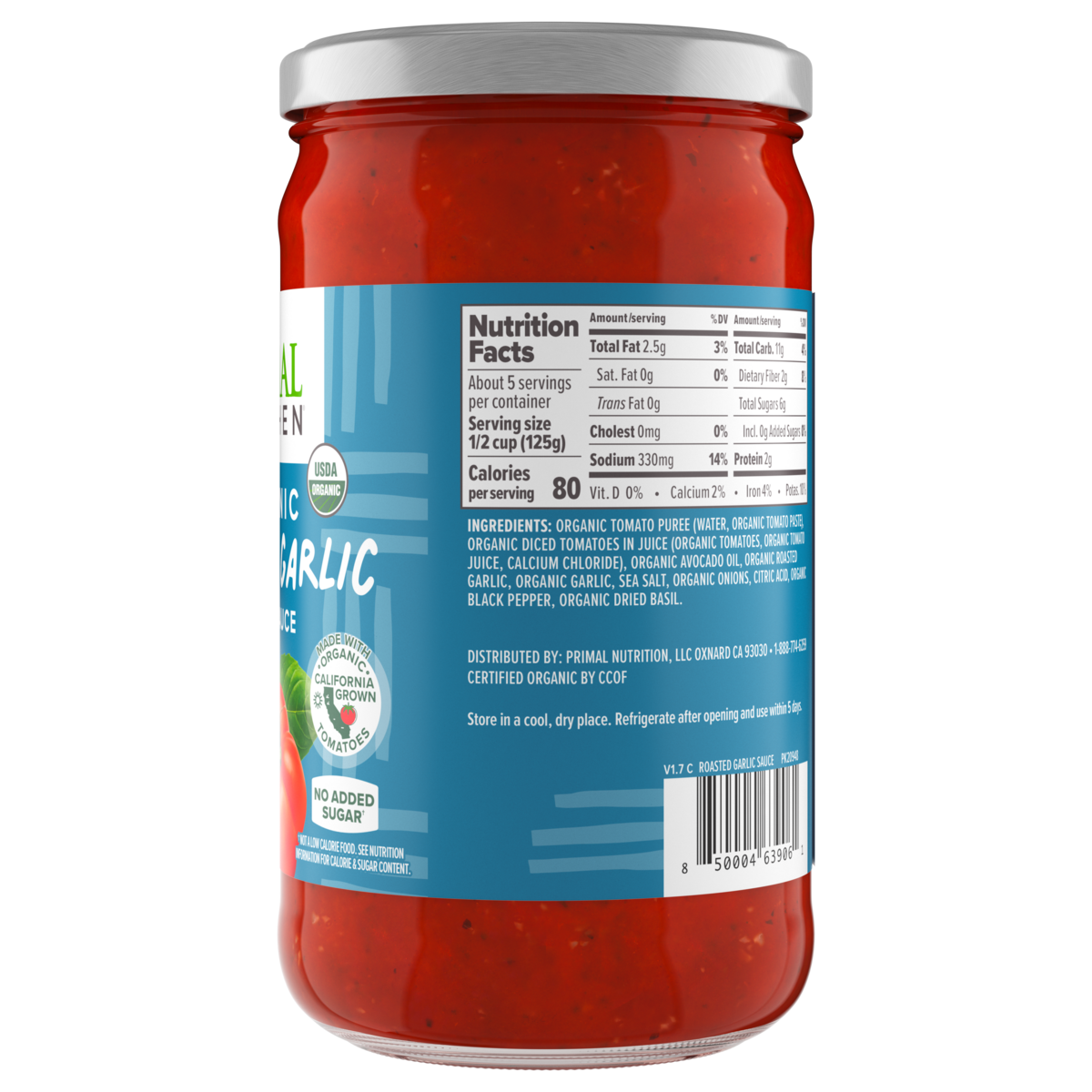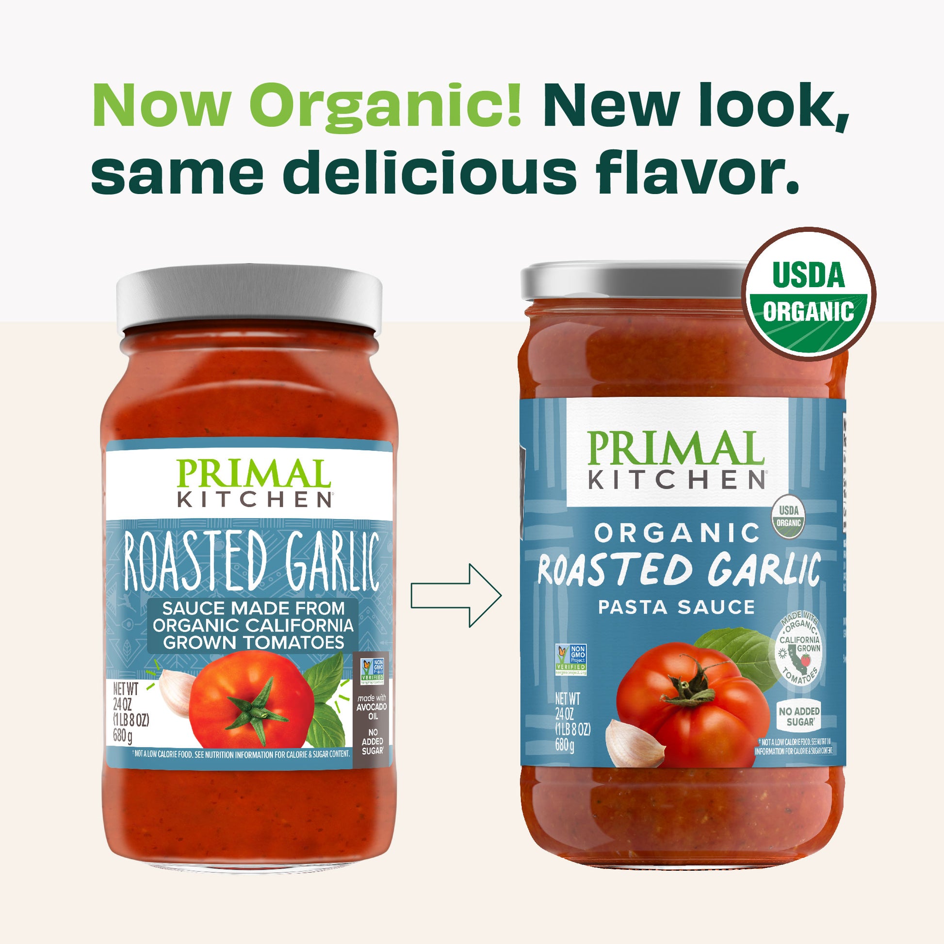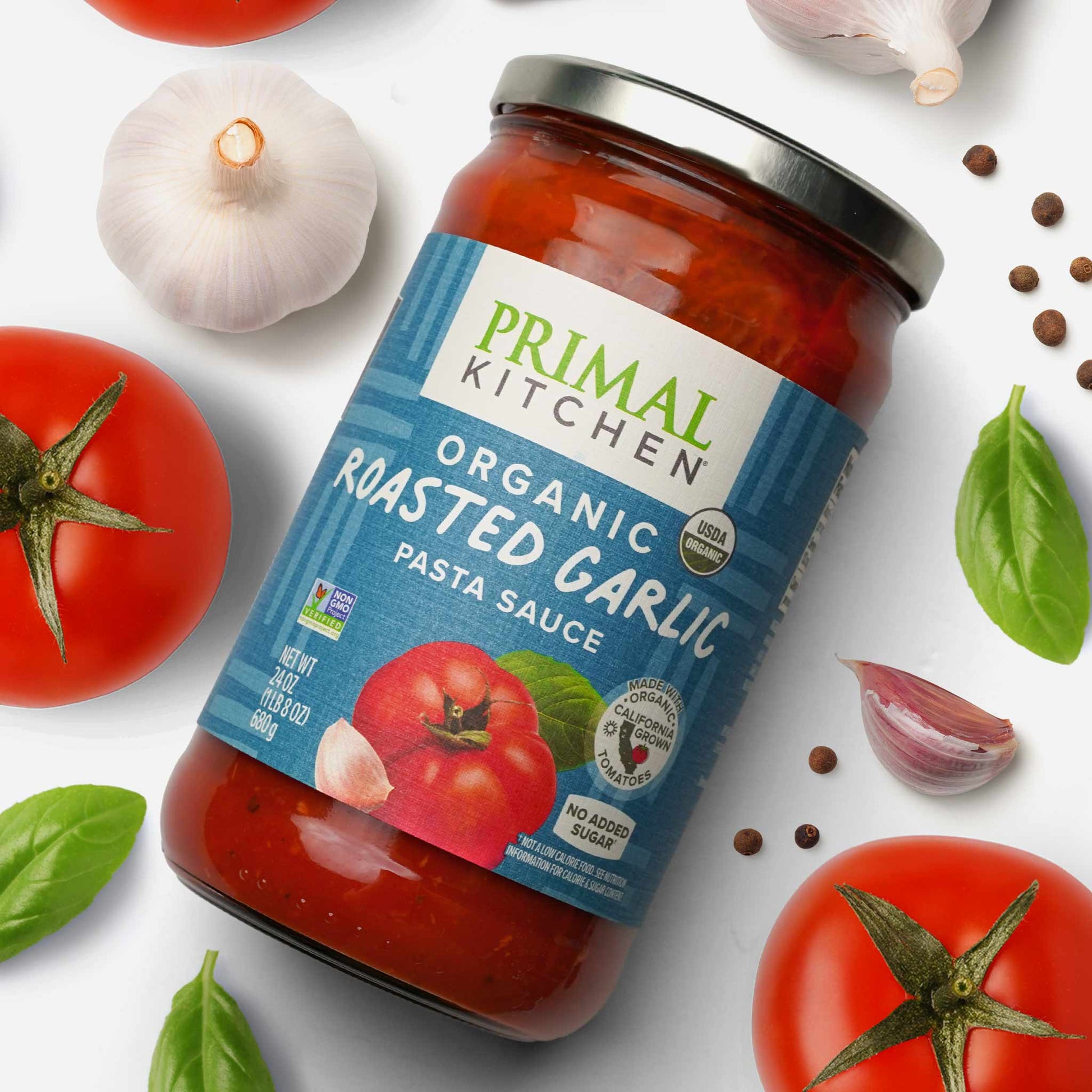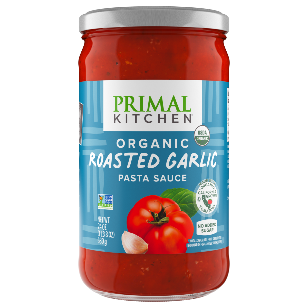 Primal Kitchen® Roasted Garlic Marinara Sauce made with avocado oil is here and bursting with hearty, savory flavor! Our Roasted Garlic Marinara is made with only high-quality ingredients like California-grown organic tomatoes, roasted garlic, basil, and sea salt. This plant-based sauce is made without gluten, soy, or canola oil and is Paleo-certified and Whole30 Approved®.