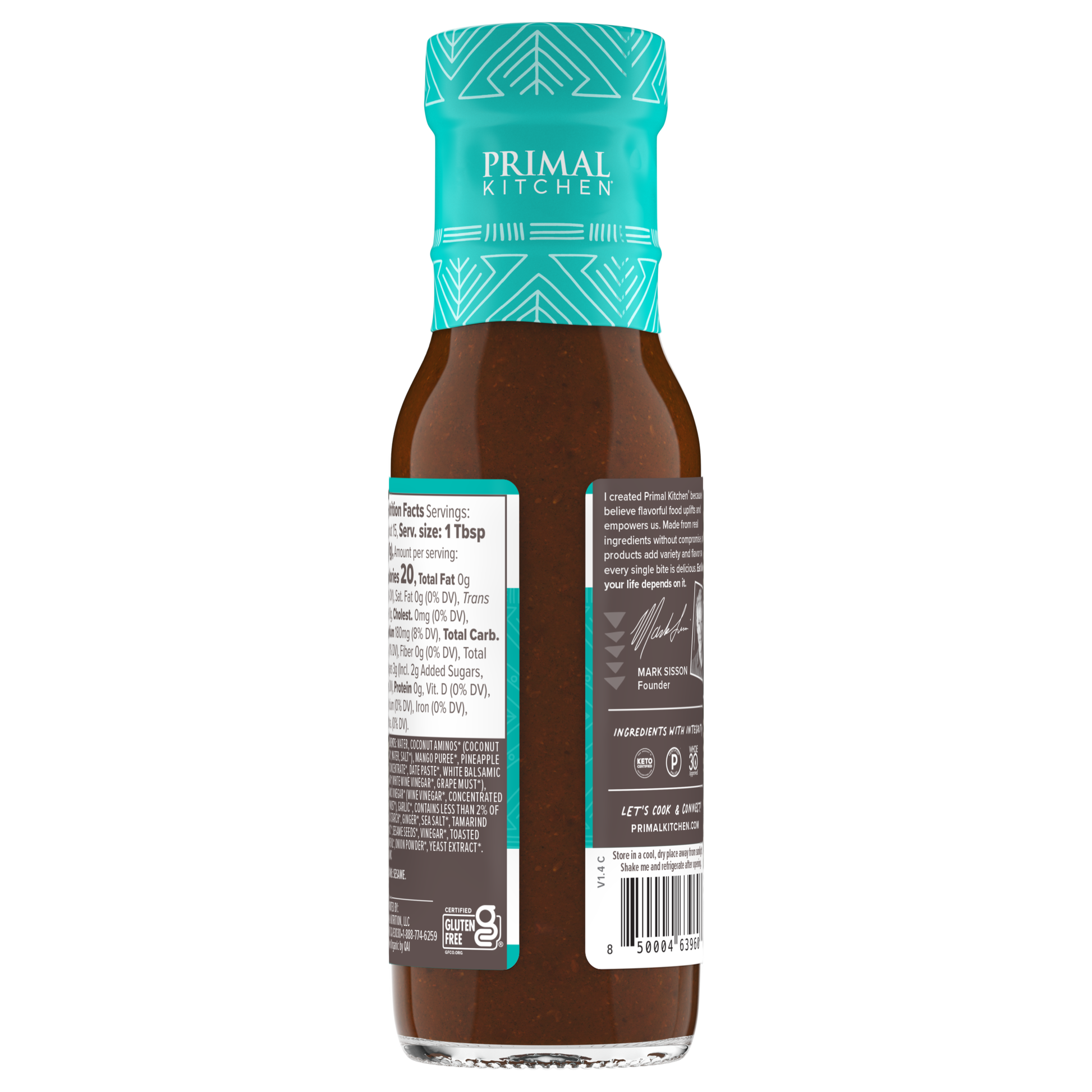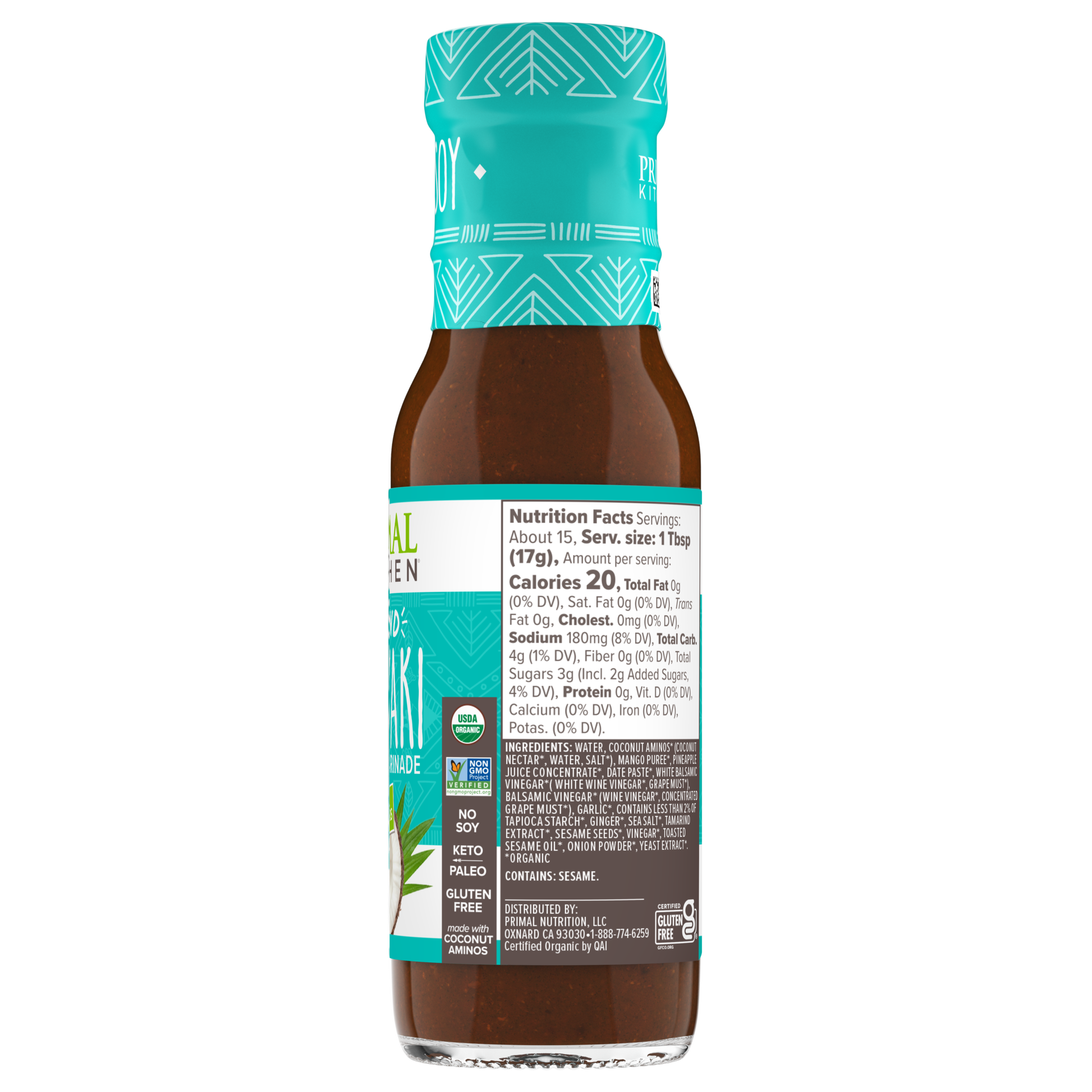 Water, Organic Coconut Aminos (Organic Coconut Syrup, Water, Himalayan Salt), Organic Pineapple Juice Concentrate, Organic Mango Puree, Organic Date Paste, Organic White Balsamic Vinegar (Organic White Wine Vinegar, Organic Grape Must), Organic Balsamic Vinegar (Organic Wine Vinegar, Organic Concentrated Grape Must), Organic Garlic, Organic Tapioca Starch, Organic Ginger, Sea Salt, Organic Tamarind, Organic Sesame Seeds, Organic Distilled Vinegar, Organic Sesame Oil, Organic Onion Powder, Organic Yeast Extract.