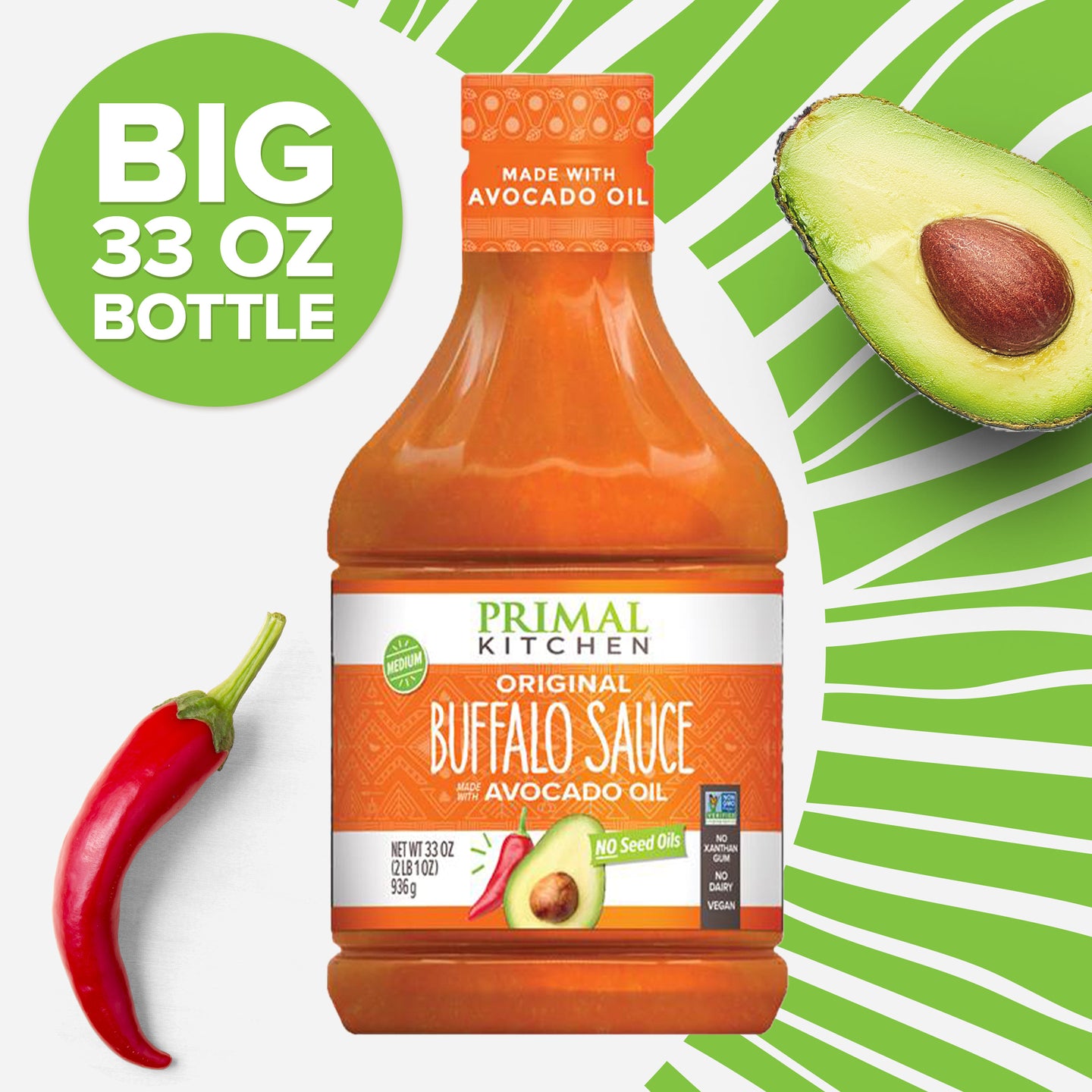 Now in a BIG 33 oz bottle, Primal Kitchen Original Buffalo Sauce is so creamy and delicious that you’ll want to drip, drizzle, and slather it on everything from classic wings to protein bowls.