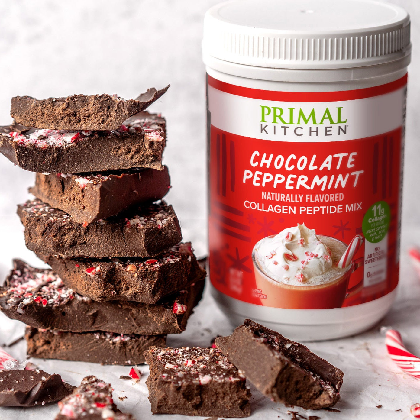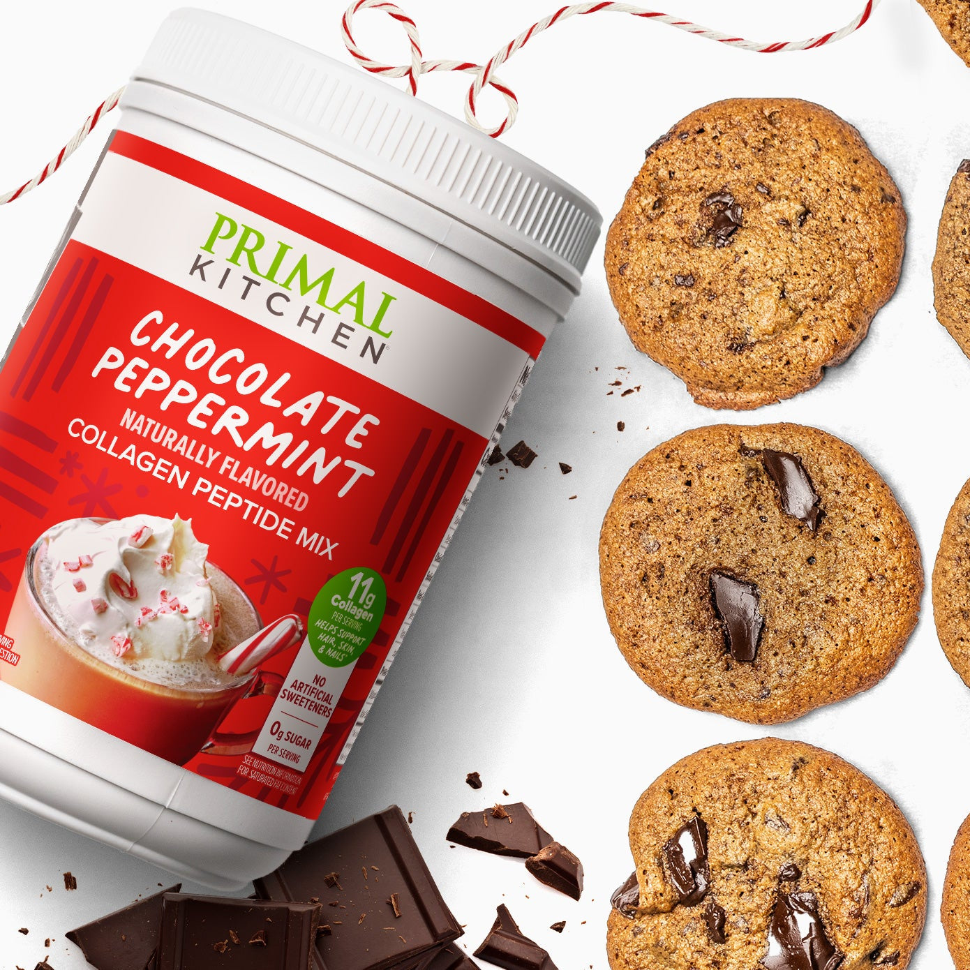 Get your winter glowing with the flavors of cozy cocoa and bright peppermint! With 11g of collagen per serving, Primal Kitchen Chocolate Peppermint Collagen Drink Mix gives the gift of skin, hair, and nail support in every cozy sip.