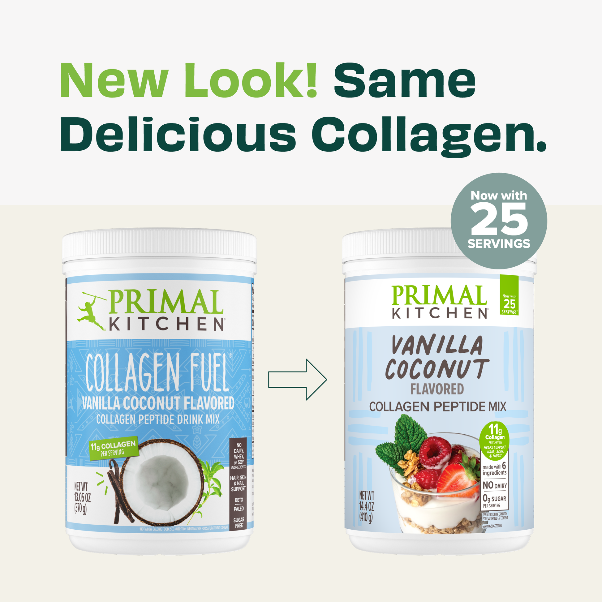 Now with 25 servings per container! Shake up your routine with the delectable taste of Primal Kitchen Vanilla Coconut Collagen made from 6 trusted ingredients. Sweetened with monk fruit, this vanilla collagen powder packs 11g of collagen in every scoop to support hair, skin & nails.