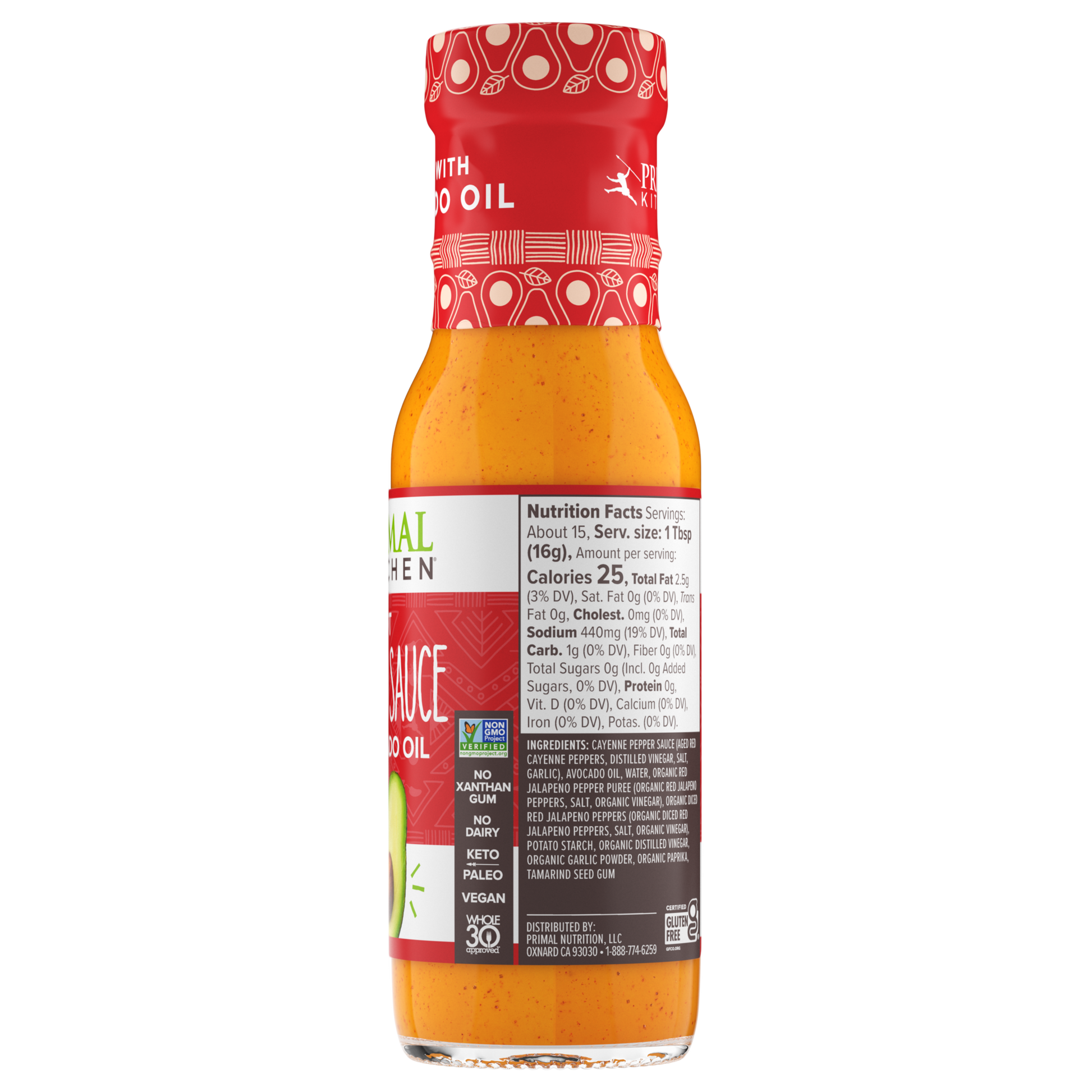 Turn up the heat on Buffalo! Hot Buffalo Sauce is the extra-hot, fully loaded version of our best-selling Buffalo Sauce. Primal Kitchen Hot Buffalo Sauce is made with high-quality, delicious ingredients like avocado oil and kickin' red cayenne peppers for a vegan, Keto Certified, Certified Paleo, and Whole30 Approved® feisty sauce!